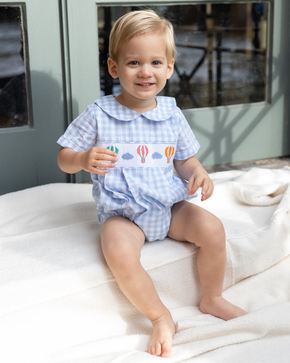 This charming boy's bubble features a whimsical design with smocked hot air balloons that bring a touch of adventure to any little one's wardrobe.