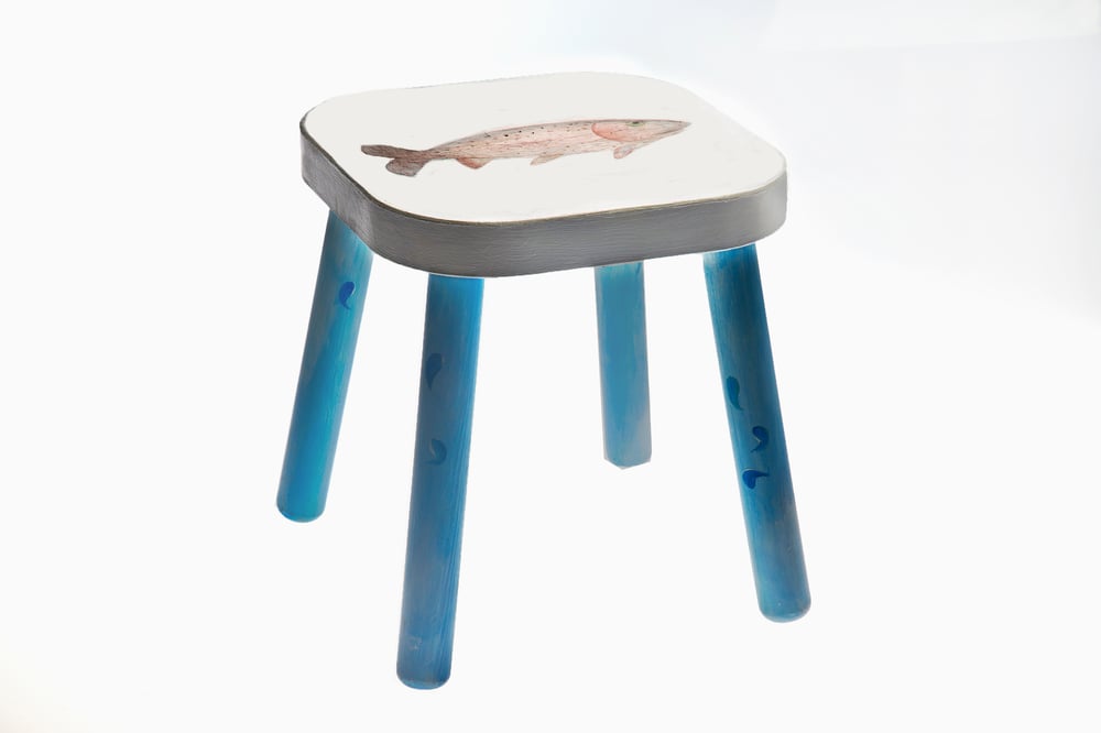 hand-painted portrait of Tucker the Trout sits atop four sea splashed legs.